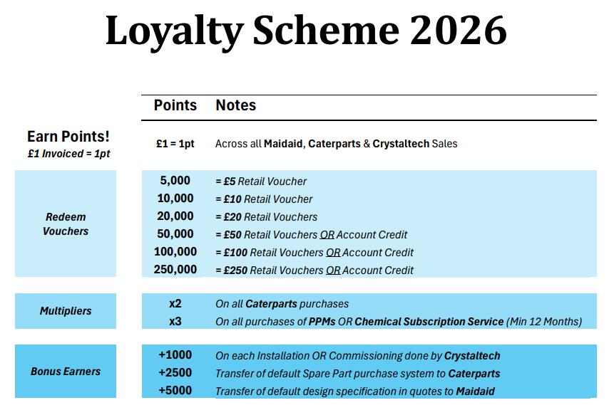 You can earn points on purchases made with Maidaid, Caterparts and Crystaltech making it even easier to build rewards across your business.